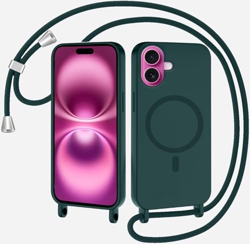xinyunew Coque Magnétique pour iPhone 17 avec Cordon, Compatible avec MagSafe Collier Étui Silicone Liquide avec Tour de Cou Lanière en Corde Souple TPU Antichoc Housse pour iPhone 17,Vert Encre