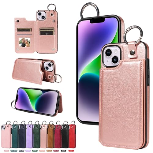 Étui de protection For téléphone compatible avec iPhone 14 Plus 6.7, étui portefeuille poches For cartes en cuir PU, coque arrière anneau, double fermoir magnétique et résistante aux chocs(Rose Gold)