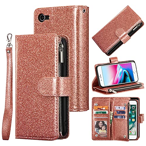 UEEBAI Coque pour iPhone 7/iPhone 8/iPhone SE 2020, Etui en Cuir PU Portefeuille Rétro Antichoc Flip Case Housse avec Fentes de Cartes Fonction Support, Fermeture Magnétique - Or Rose pailleté