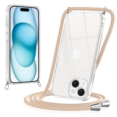 Knrlqim Coque pour iPhone 15 avec Cordon,Etui avec Collier Transparente Silicone Housse avec Réglable Téléphone Étui Portable Lanyard Case Protection Cover pour iPhone 15,Kaki