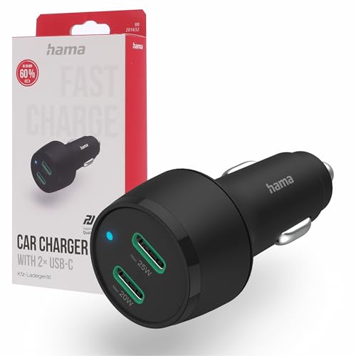 Hama 45W Chargeur Allume Cigare USB C Rapide Compatible iPhone, Samsung, MacBook - [PD + QC 3.0] [Recharge Optimisée] [2 Ports USB C] Noir