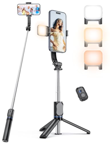 Perché à Selfie avec Support de Téléphone Détachable, Trepied Smartphone Extensible jusqu'à 106 CM avec Télécommande, pour iPhone, Samsung et Android (Noir avec Lumière)