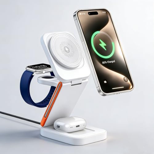 Chargeur sans Fil 3‑en‑1 Pliable 15 W, Station de Charge magnétique pour iPhone, Apple Watch et AirPods, Support de Bureau et de Voyage Compact (Blanc)