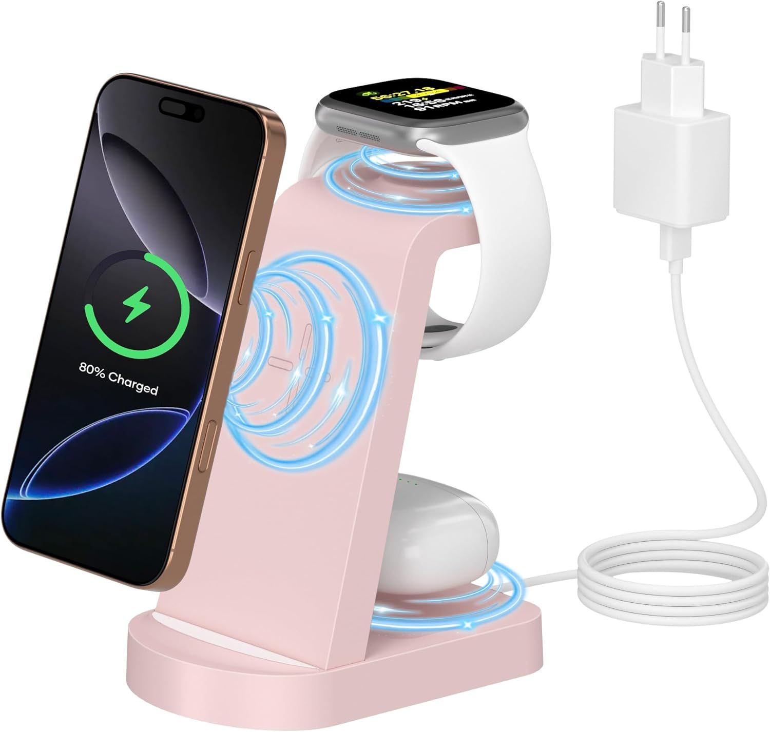 Chargeur Induction,Station De Charge Sans Fil 3 En 1 (Avec Adaptateur 18W) Station De Charge Compatible Avec Iphone 16/15/14/13/12 Pro/Promax,Apple Watch Ultra/10/9/8/7/6/5/4/Se,Airpods Pro Rose