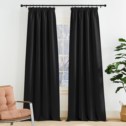 PONY DANCE Lot de 2 Rideaux Occultant Galon Fronceur et Passe Tringle, Rideau Noir Opaque 140x245cm(LxH), Thermique Isolant Decoration pour Fenetre Chambre Salon Maison, Noir