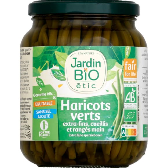 Jardin bio / haricots verts rangñs main sans sel ajoute bio* / bocal verre de 660g