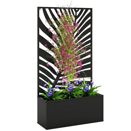 Outsunny Jardinière avec treillis, brise-vue paravent, jardinière extérieure métal sur pieds ou murale, motifs de feuilles ajourée, bac à fleurs rectangulaire balcon terrasse patio, 61x23x113 cm, noir