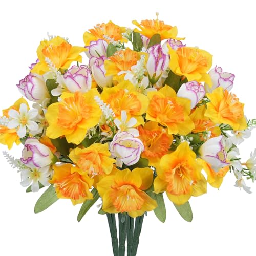 Fairblo 4 Pièces Fleurs Artificielles Deco Bouquet de Fleurs Artificielles en Soie Jonquilles Jaune Interieur Fleur Artificielle Décoration pour Vase Cimetière Jardinière Mariage Maison Table