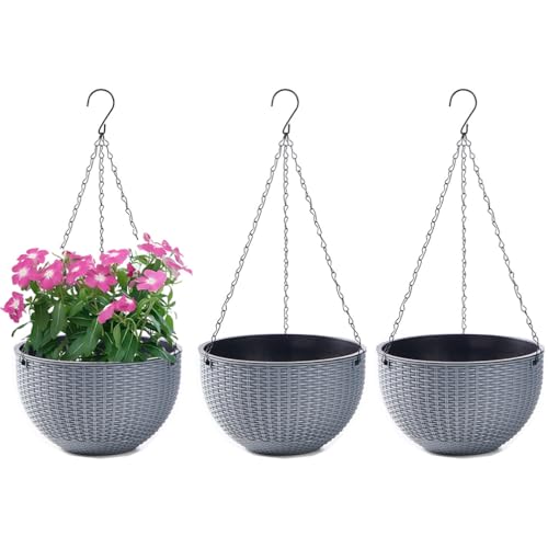 WOWEI Lot de 3 Pots de Fleurs Suspendus avec Nchaînes en Acier Inoxydable Pot Suspendu Plante avec Réservoir d'eau et Trou de Drainage Intérieur Exterieur Balcon et Jardiniere Suspendue (Gris, M)