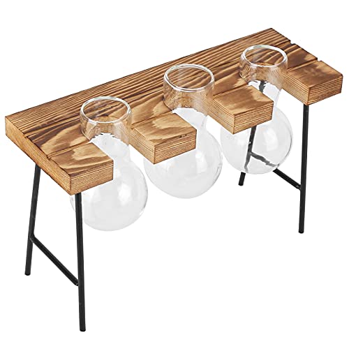 Adfaga Vase d'ampoule de jardinière en Verre avec Support en Bois Terrarium hydroponique de Style rétro pour la décoration de Bureau à Domicile Verre à Haute teneur en Borosilicate (Trois Bouteilles