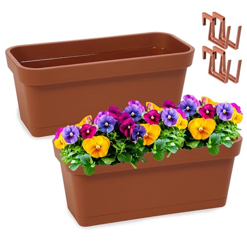 Acan Lot de 2 jardinières balcon en plastique avec assiette sans support 40 x 20 x 17,5 cm Marron Pot de fleurs rectangulaire avec trous de drainage et plateau intégré