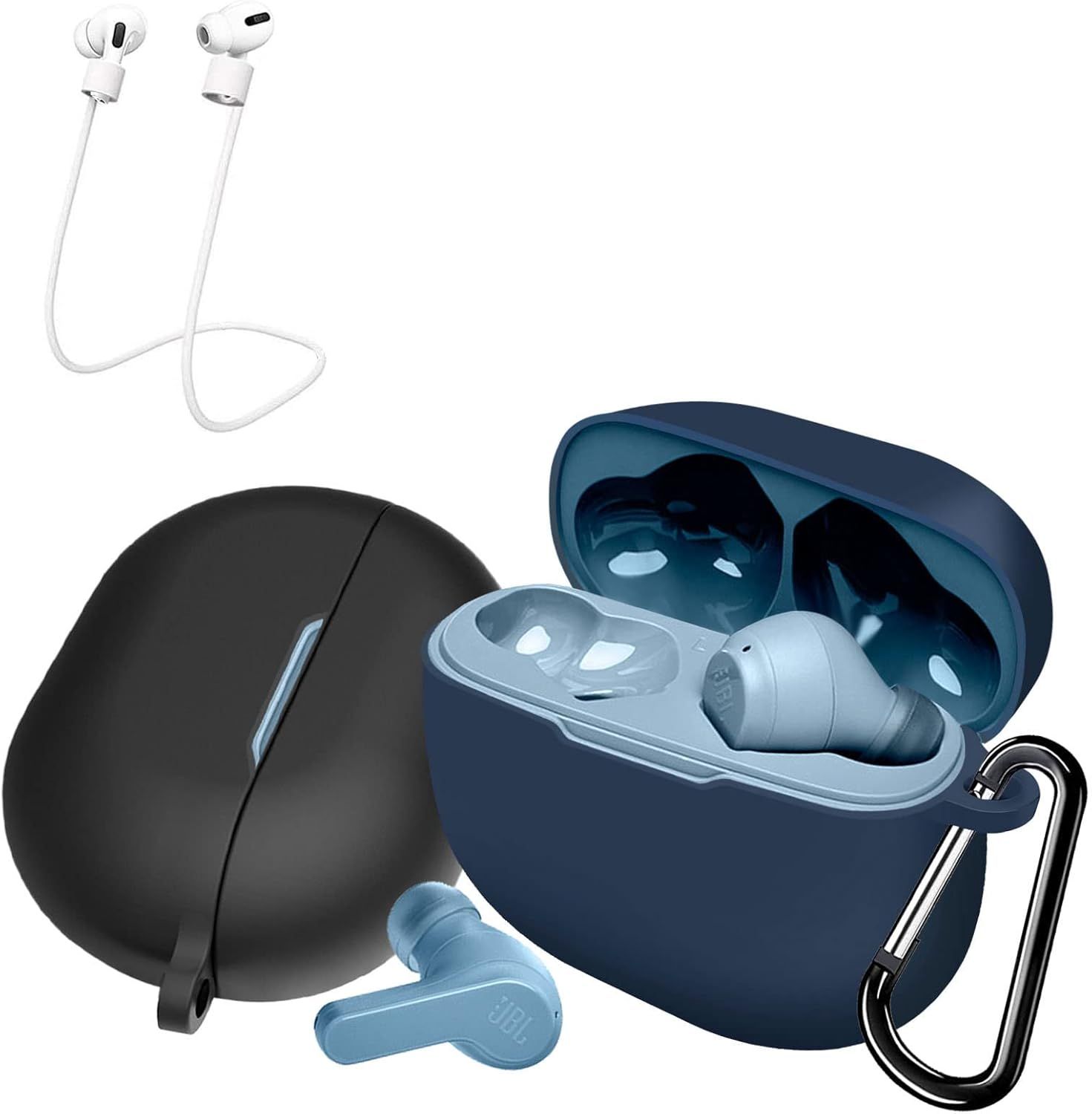 Pack De 2 Coques En Silicone Liquide Ultra-Fines Pour Jbl Wave 200tws - 2 Mousquetons & 2 Dragonnes Anti-Perte - Noir/Bleu