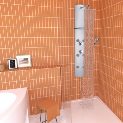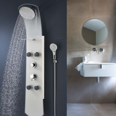 Colonne de douche thermostatique hydromassante 4 buses avec tablette, pomme de tête, douchette 3 jets et flexible, verre blanc, Valentin Nautilus