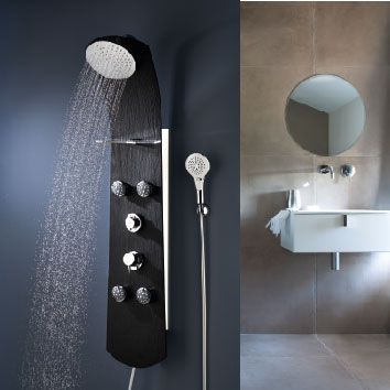 Colonne de douche thermostatique hydromassante 4 buses avec tablette, pomme de tête, douchette 3 jets et flexible, noir mat, Valentin Nautilus