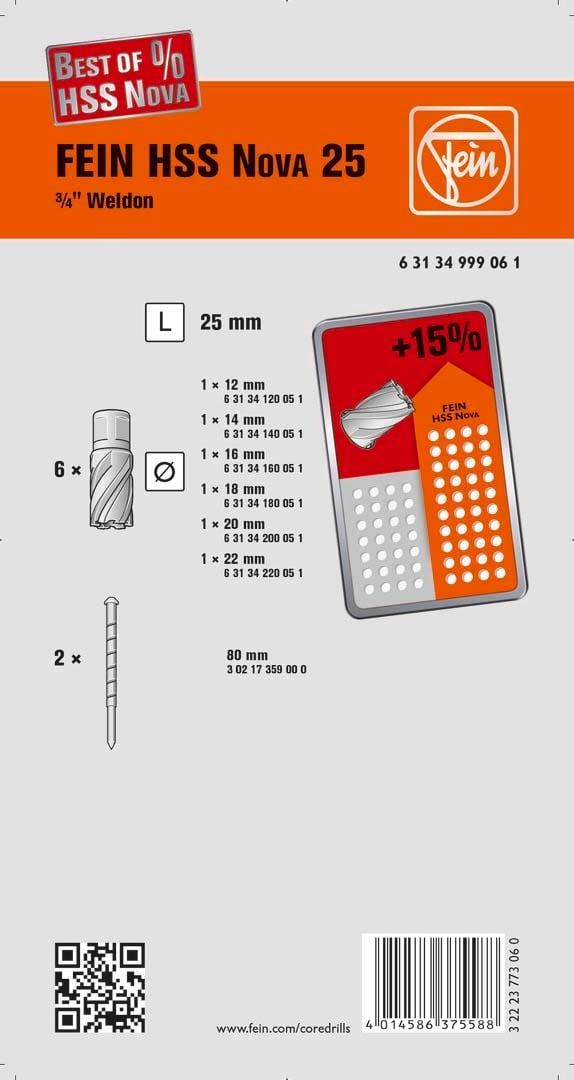 Jeu de carottage Best Of 8 pces. D.12-22mm HSS T.de coupe 25mm Weldon FEIN