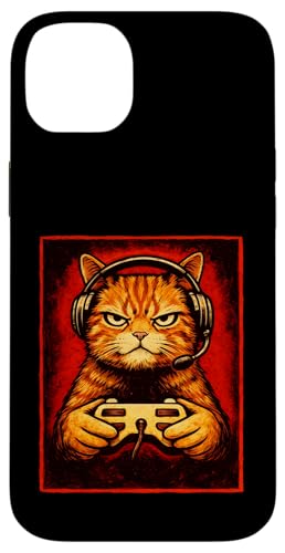 Chat Gamer Graphique Amusant Animal de Jeu Grincheux Chat Orange Coque pour iPhone 15 Plus