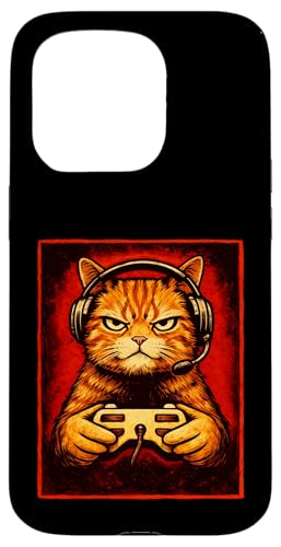 Chat Gamer Graphique Amusant Animal de Jeu Grincheux Chat Orange Coque pour iPhone 15 Pro