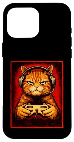 Chat Gamer Graphique Amusant Animal de Jeu Grincheux Chat Orange Coque pour iPhone 16 Pro Max