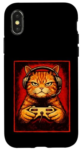 Chat Gamer Graphique Amusant Animal de Jeu Grincheux Chat Orange Coque pour iPhone X/XS