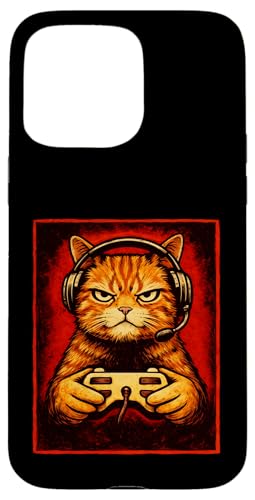 Chat Gamer Graphique Amusant Animal de Jeu Grincheux Chat Orange Coque pour iPhone 15 Pro Max