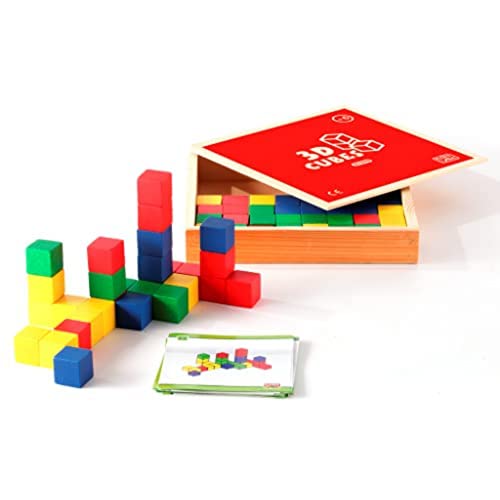 Edufun- Pédagogie Montessori-Les Cubes 3D-Jeu de Construction en Bois et Ses Fiches de Travail, EF 31370, Multicolore