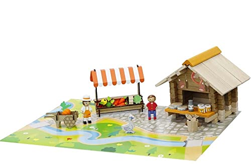 La Place du Marché - 80 pièces : Jeu de Construction en Bois Naturel et teinté - Un Tapis de Jeu et de Nombreux Accessoires - Jeu de Construction - Âge Minimum : 3 Ans