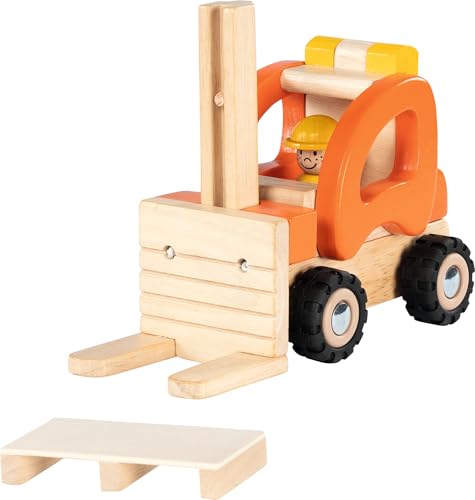 goki 55850 Chariot élévateur en bois, véhicule de jeu robuste avec pneus en caoutchouc mobiles, surface de chargement réglable et palette, favorise la motricité et l'imagination des enfants, 20 cm x 9