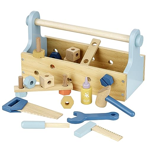 Baroni Toys Kit d'Outils de Menuisier Portable en Bois Montessori, Boîte à Outils de Jeu en Bois pour Enfants, Jeu éducatif de Rôle pour Enfant de 3 à 7 ans, Jeu en Bois 18 pièces, 32x14x20 cm