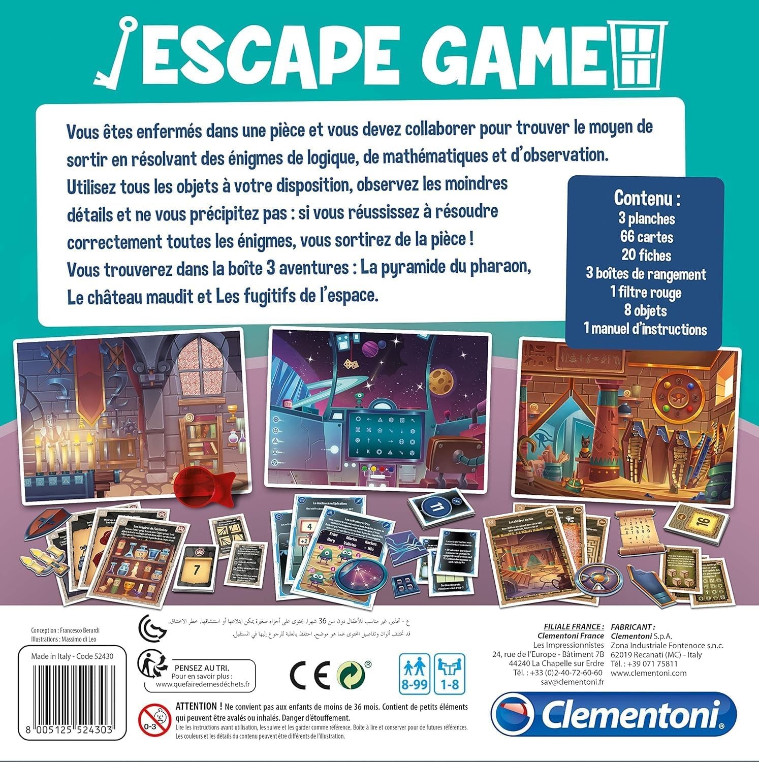 Clementoni | Escape Game Enfant 8 Ans+ | Jeu De Société Éducatif Coopératif | 3 Aventures Thématiques : Pyramide du Pharaon, Château Maudit, Espace | Activité Logique | Idée Cadeau
