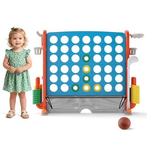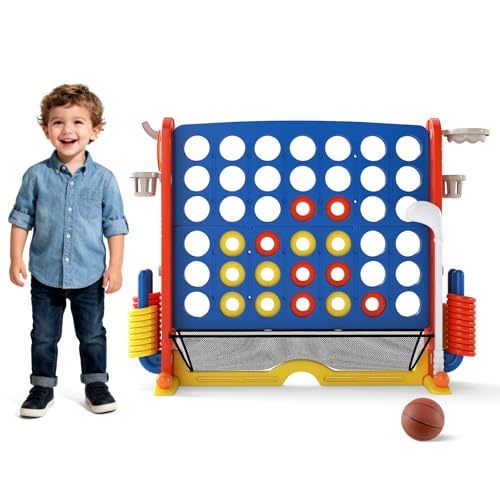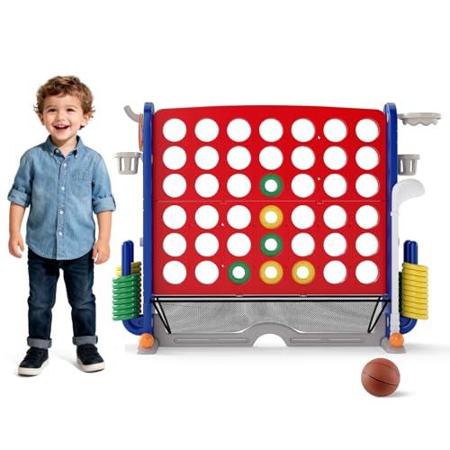 HOMASIS Jeu géant 4 Gagnants, Jeu 4 en 1 avec Panier de Basket & Lancer, Jeu de Stratégie avec 42 Anneaux, XXL Jeu de société Jouet pour Enfants & Adultes Extérieur (Rouge)