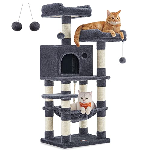Feandrea Arbre à Chat Hauteur 143 cm, Tour de Jeux pour Chat, avec 11 Poteaux à Griffer, 2 Plateformes, 1 Niche, 1 Hamac, 2 Pompons, en Tissu Peluche, Plusieurs Niveaux, Gris Fumé PCT15GYZ