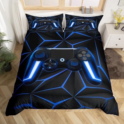 Homewish Housse de Couette 200x200 Gamer Garcon, Ensemble de Literie Manette de Jeux pour Enfants Ados, Parure de Lit Microfibre Géométrie, Housse Couette Jeux Vidéo, 2 Taies d'oreiller, Bleu