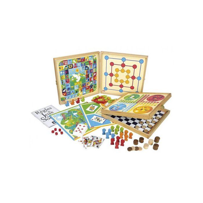 Malette Coffret bois Jeux de societe classiques 80 regles (16 chevaux 4 oies 40 dames jetons 5 des) - Plateau - Pour Jeujura