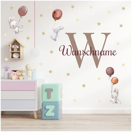 Stickers muraux personnalisés Stickers aquarelle animaux avec nom Sticker muraux pour chambre d'enfant chambre de bébé salle de jeux fille Y037 (Avec votre nom, No 7 lapins avec ballons tons terre)