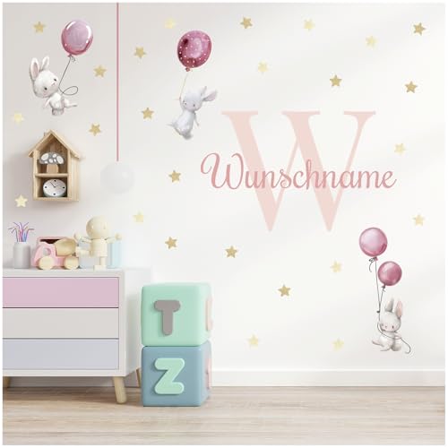 yabaduu Stickers muraux personnalisés Stickers aquarelle animaux avec nom Sticker muraux pour chambre d'enfant chambre de bébé salle de jeux fille Y037 (Sans nom, No 6 Lapins avec ballons Rose)