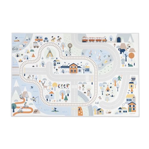 Janod - Tapis Voiture Enfant - Thème Montagne Hiver - Doux & Antidérapant - Motif Sport & Vallée - Tapis de Jeux Chambre Fille & Garçon - 120 x 78cm - Lavable à la Main – A partir de 2 Ans - J05940