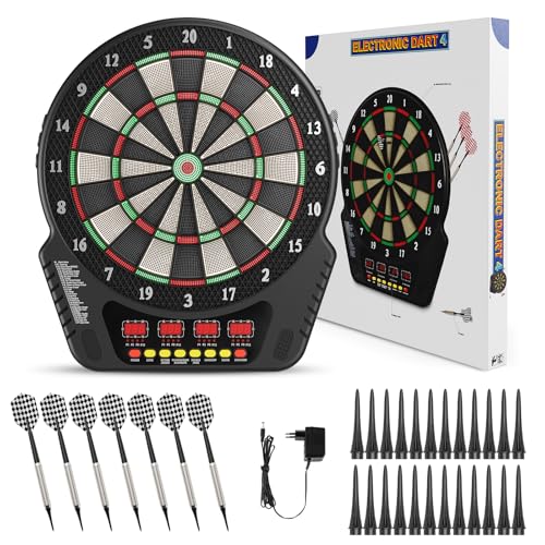 DREAMADE Cible/Jeu de Fléchettes Electronique avec 12 Fléchettes,27 Jeux,216 Jeux Variations,4 Ecrans LED,Volume Réglable pour 1-8 Joueurs dans Maison,Bureau,Bar