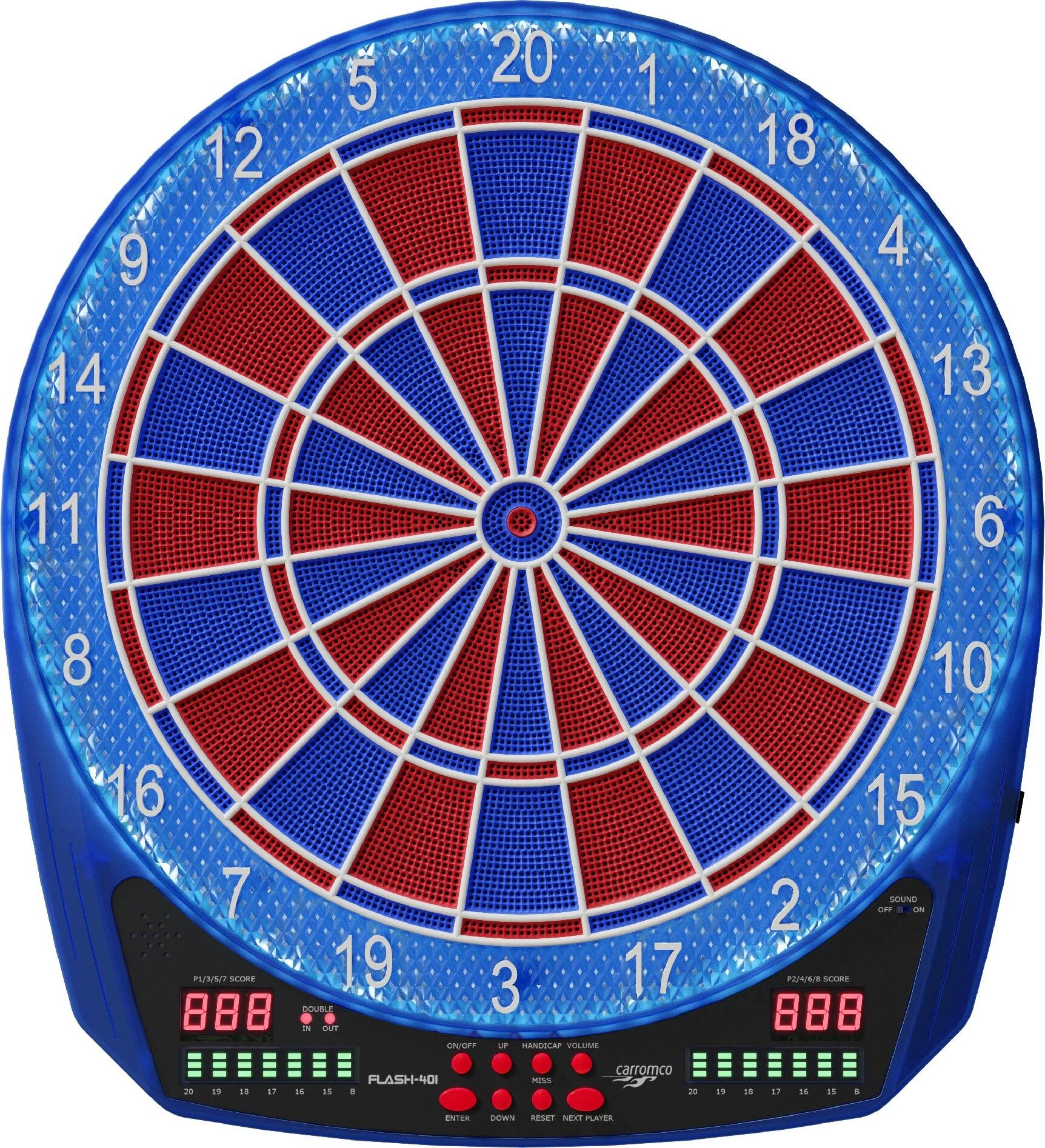 Carromco FLASH-401 Cible de fléchettes électronique Professionnelle avec espacement à 2 Trous et éclairage LED, pour 1 à 8 Joueurs, 35 Jeux, 584 Variantes, Bleu/Rouge, 42 x 3,2 x 46 cm, Jeu de
