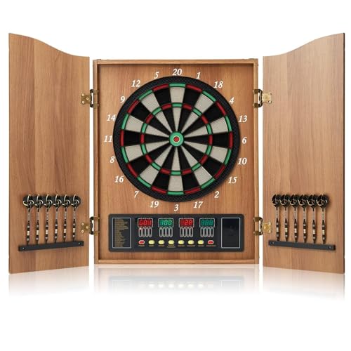 Armoire de Jeu de fléchettes électronique avec Portes en Bois, 12 fléchettes à Pointe Souple, Tableau de Bord LED, 27 Jeux et 243 Variations, Notation Automatique pour la Maison, Le Bar, Les fêtes