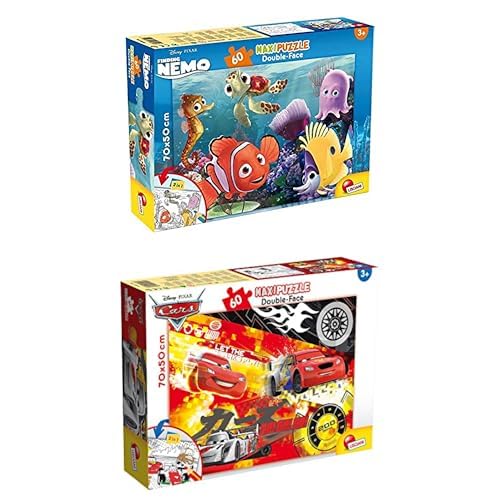 LISCIANI - LOT 2 Puzzles Disney 2 en 1 - Némo (Géant 70x50cm) + Cars - 60 Pièces Chacun - Double Face à Colorier - Feutres Inclus - Jeux Éducatifs Enfants 3-4+ Ans - Fabriqué en Italie