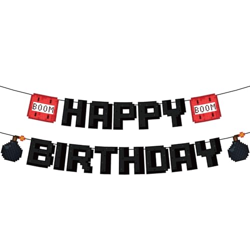 Bannière Happy Birthday, Bannière Pré-Montée sur le Thème des Pixels Noirs Décorations Fête d'Anniversaire Créatives Toile de Fond Photo Fournitures de Fête sur le Thème des Jeux Vidéo