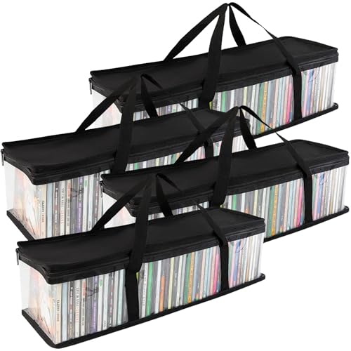 BAIFULAI Lot de 4 sacs de rangement pour DVD, 60 x 15 x 22 cm, pour 160 DVD, CD, jeux vidéo, PVC transparent et tissu polyester, avec fermeture éclair et poignées renforcées