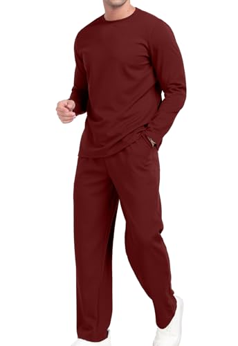 KUYIGO Survêtement 2 pièces à col rond pour homme - Pull à manches longues - Sweat et jogging - Haut gaufré - Pantalon de sport décontracté - Tailles S à XXL, rouge vin, XL