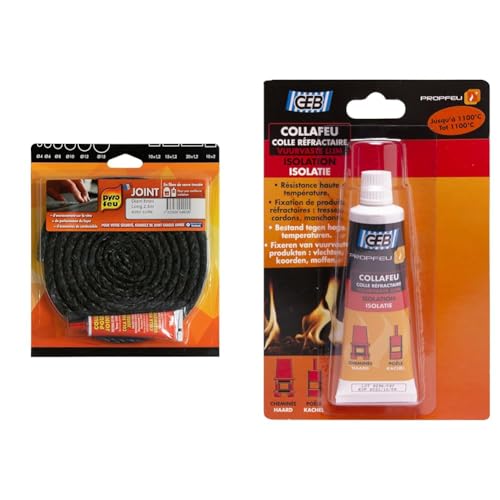 Pyrofeu - Joint Noir en Fibre de Verre - Diamètre 8, 2m50 - Résiste à 500°C - Fabrication Française - Tube de Colle 17ml Inclus & GEB 125230 Collafeu pour fixation de produits réfractaires Tube 50 ml