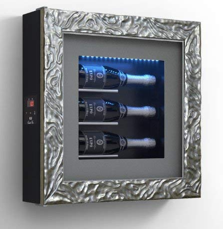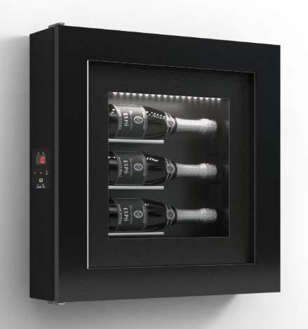 dafnedesign. com – Cadre vin – Présentoir réfrigéré pour trois bouteilles en horizontale. Structure en métal. Structure de porte en aluminium. Cadre en bois HPL vetrocamera 20 mm. Joint magnétique.