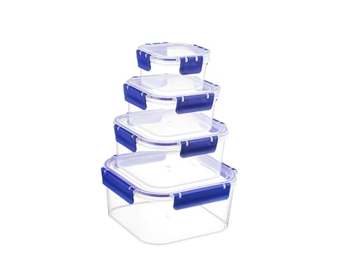H&H Lot de 4 récipients alimentaires Easymix carrés en polypropylène transparent avec joint en silicone bleu - Fermeture hermétique Clic-Clac - 400cc 900cc 1800cc 2900cc