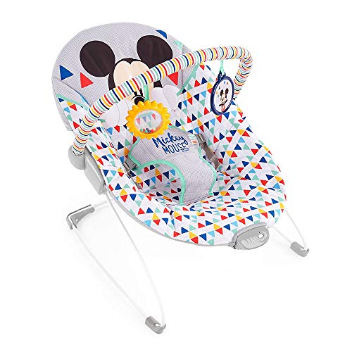 Bright Starts Disney Bébé MICKY MOUSE Transat Bébé Confortable Vibrations Apaisantes - Musique, Barre de Jouets Amovible, 0-6 Mois Jusqu'à 9 kg (Happy Triangles)