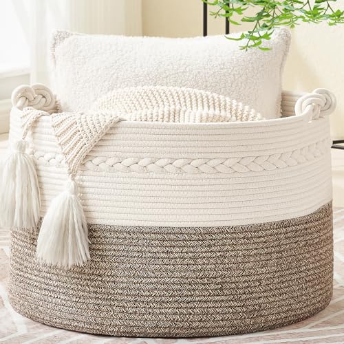 VIPOSCO Grand panier à linge, grand panier de rangement en corde tissée pour couverture, jouets, vêtements sales dans le salon, la salle de bain, la chambre à coucher – 58 L, marron et blanc