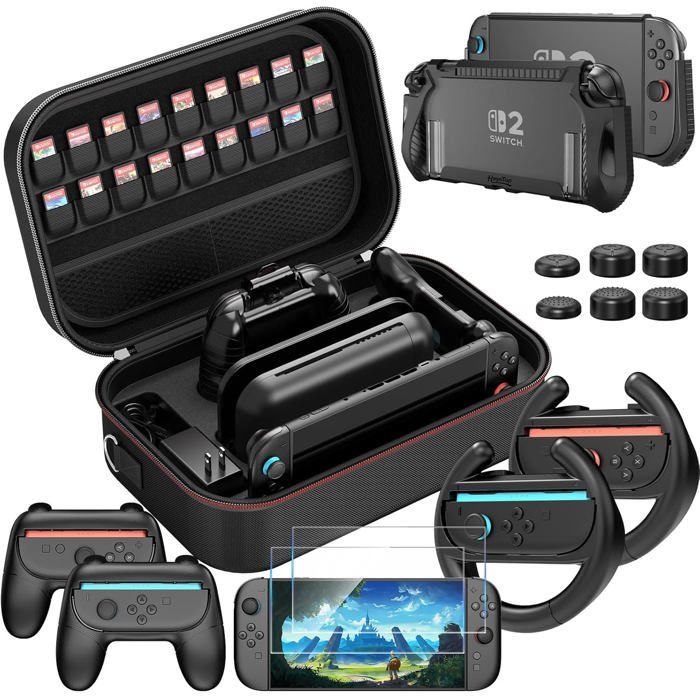 Kit Accessoires Nintendo Switch 2 Étui Protection Housse Pochette Coque Dockable Film Trempé Grip Joy-Con Volant de Course
