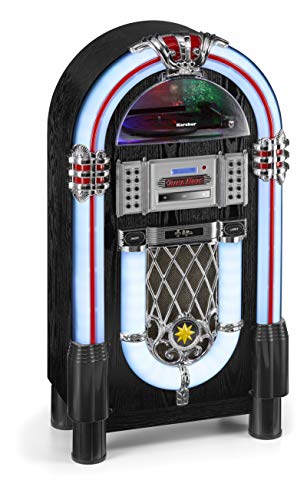Karcher JB 6608D Jukebox (avec Tourne-Disque Lecteur CD et Streaming Audio Bluetooth, Radio FM et Dab+ avec mémoire de Station, Lecture MP3 Via USB ou Carte SD, Light Show) Noir